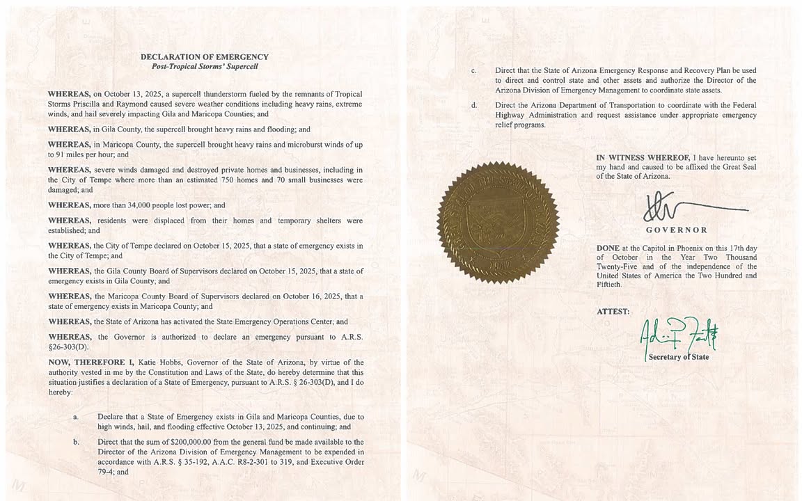Separately, on October 15, the City of Tempe and Gila County declared states of emergency, followed by Maricopa County on October 16, in response to the storm's impacts.