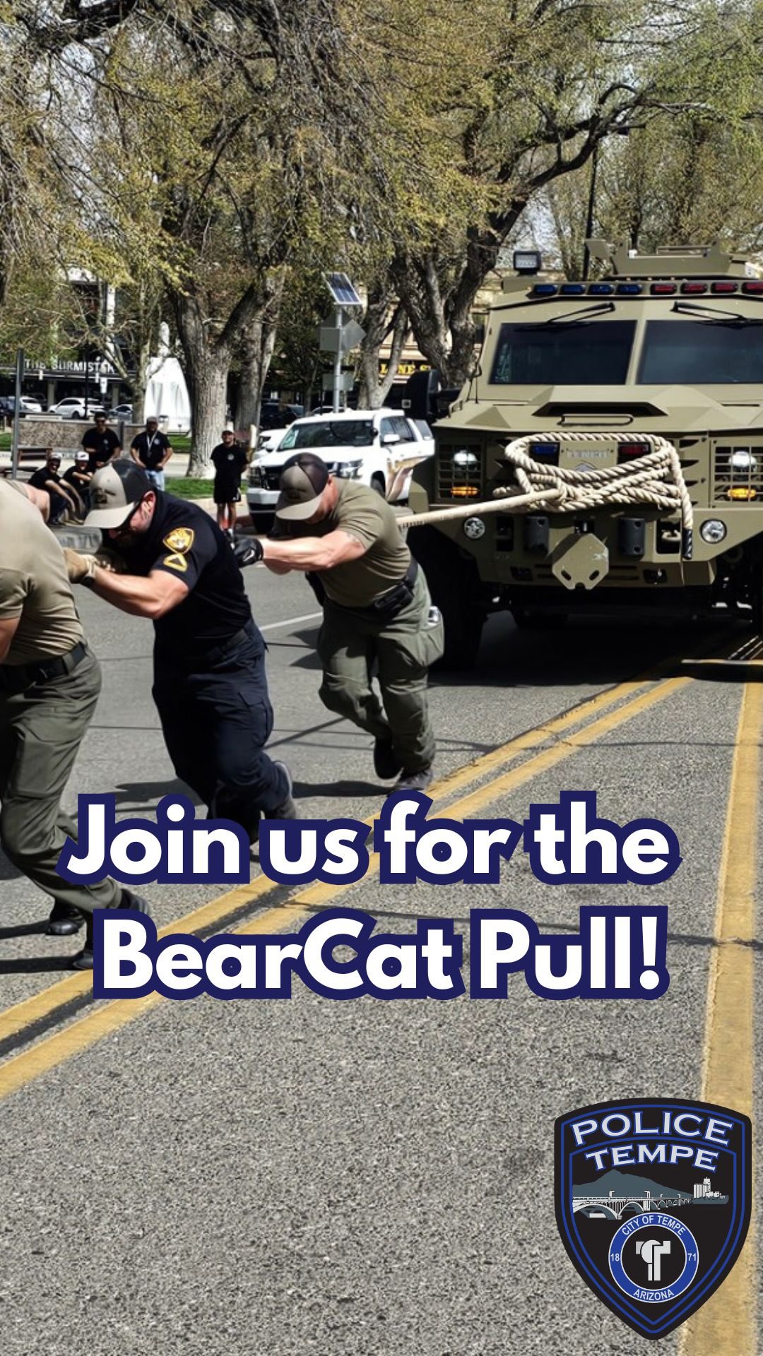 Tempe police and Scottsdale police are hosting the BearCat Pull, a fundraiser for Special Olympics Arizona, on April 4, 2026, at the Tempe/APS Joint Fire Training Center, where teams will pull a BearCat 50 feet for bragging rights and prizes; registration is at STBCP.givesmart.com and spectators are welcome.